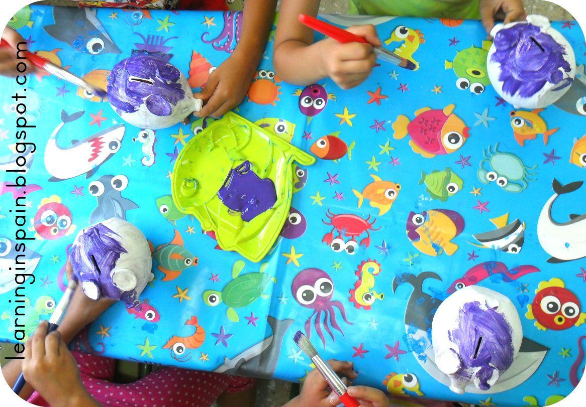 All the first and second grade teachers are doing this little piggy banks. Each kid is painting it with their favorite color and we will add polka dots next Friday. Don’t you just love my under the sea tablecloth? 🙂