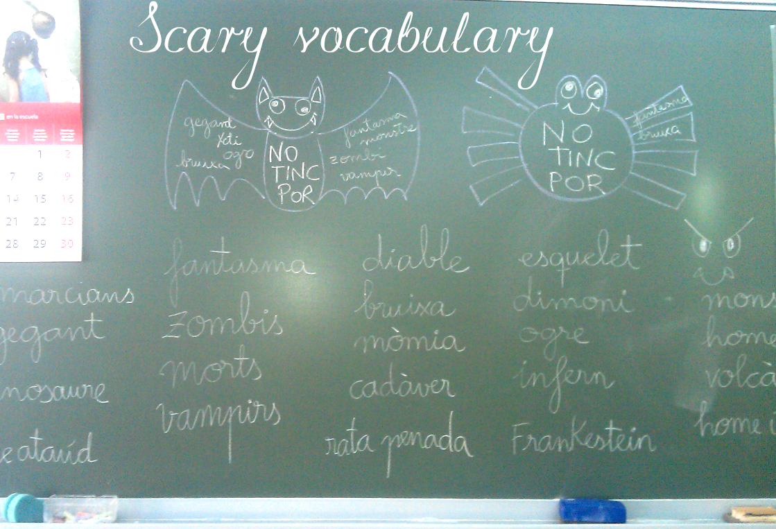We started thinking of scary vocabulary and wrote all the words on the blackboard The kids had to copy 8 of them on to their bats/spiders. I love giving them chance to choose.