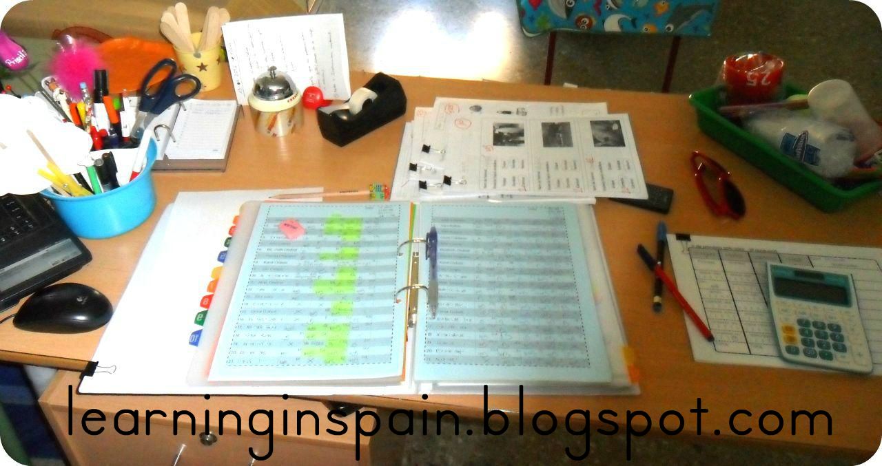 You can see my desk with my super teacher binder (I have everything in it!), a pile of tests (poor little firsties…so many tests in just two weeks), my calendar(you can’t really see how full it is), my TO DO list (standing on that red ball) and my individual rubrics for each kid (under the calculator).