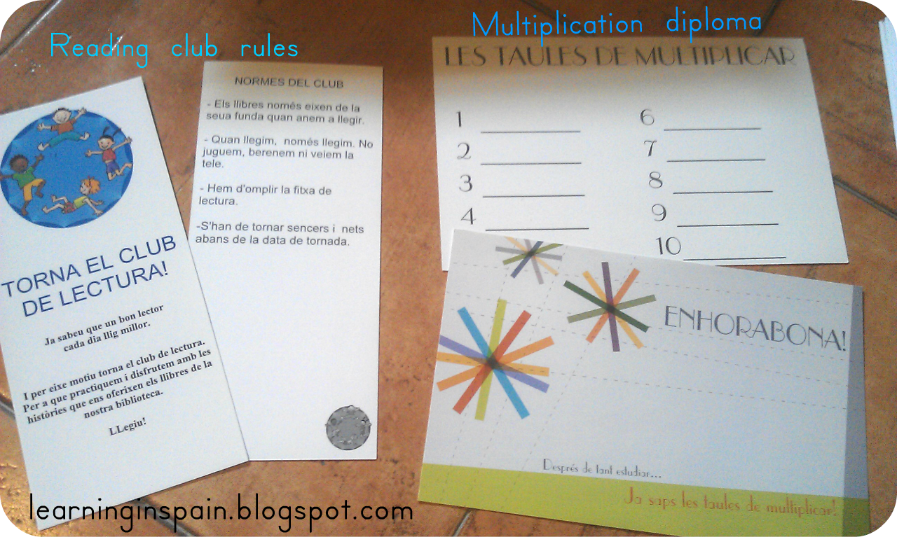 I also got those diplomas. It says something like ‘Congratulations! After so much studying you learned your time tables.’ It really sounds better in valenciano… On the back I can write down the dates when they master each table.